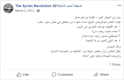 بيان تشكيل كتيبة المجاهد ابراهيم هنانو العاملة في مدينة حلب و ريفها و التابعة للجيش السوري الحر
