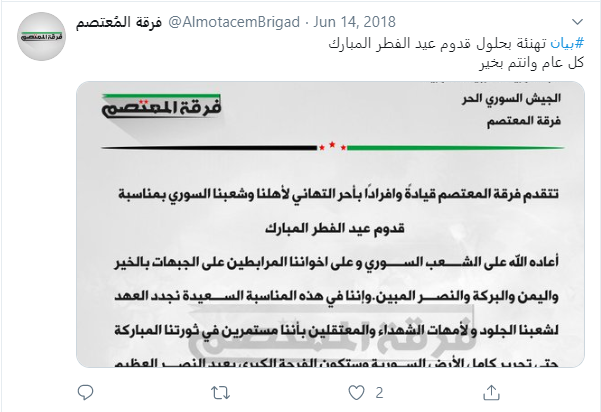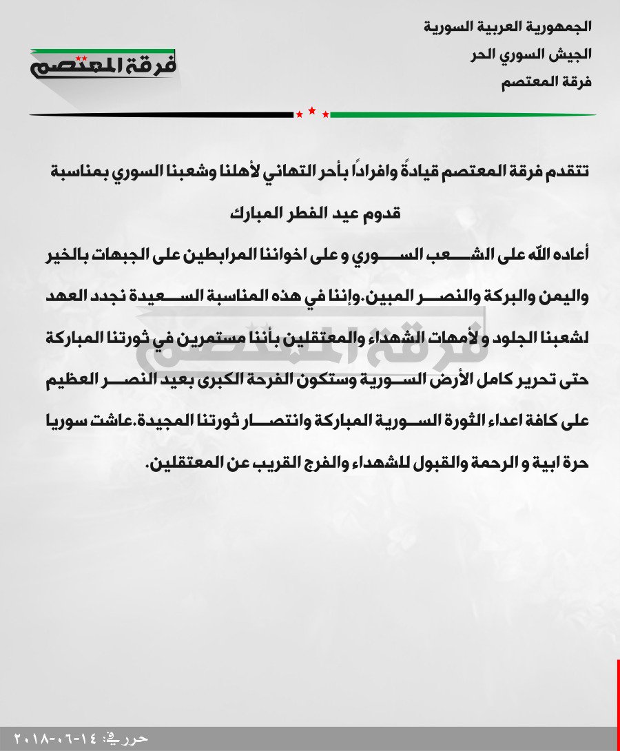 بيان من قوات الشرطة والامن العام في مدينة رأس العين تعزي فيه الجيش الوطني وفرقة المعتصم بأحد مقاتليها