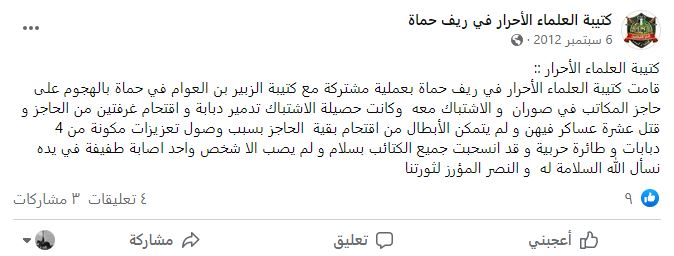 بيان تشكيلة كتيبة العلماء الأحرار في ريف حماة الشمالي