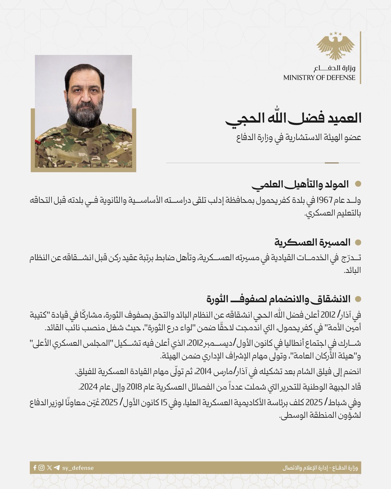ضابط برتبة عميد ركن عضو الهيئة الاستشارية في وزارة الدفاع السورية منذ 29 آذار/ مارس 2026.