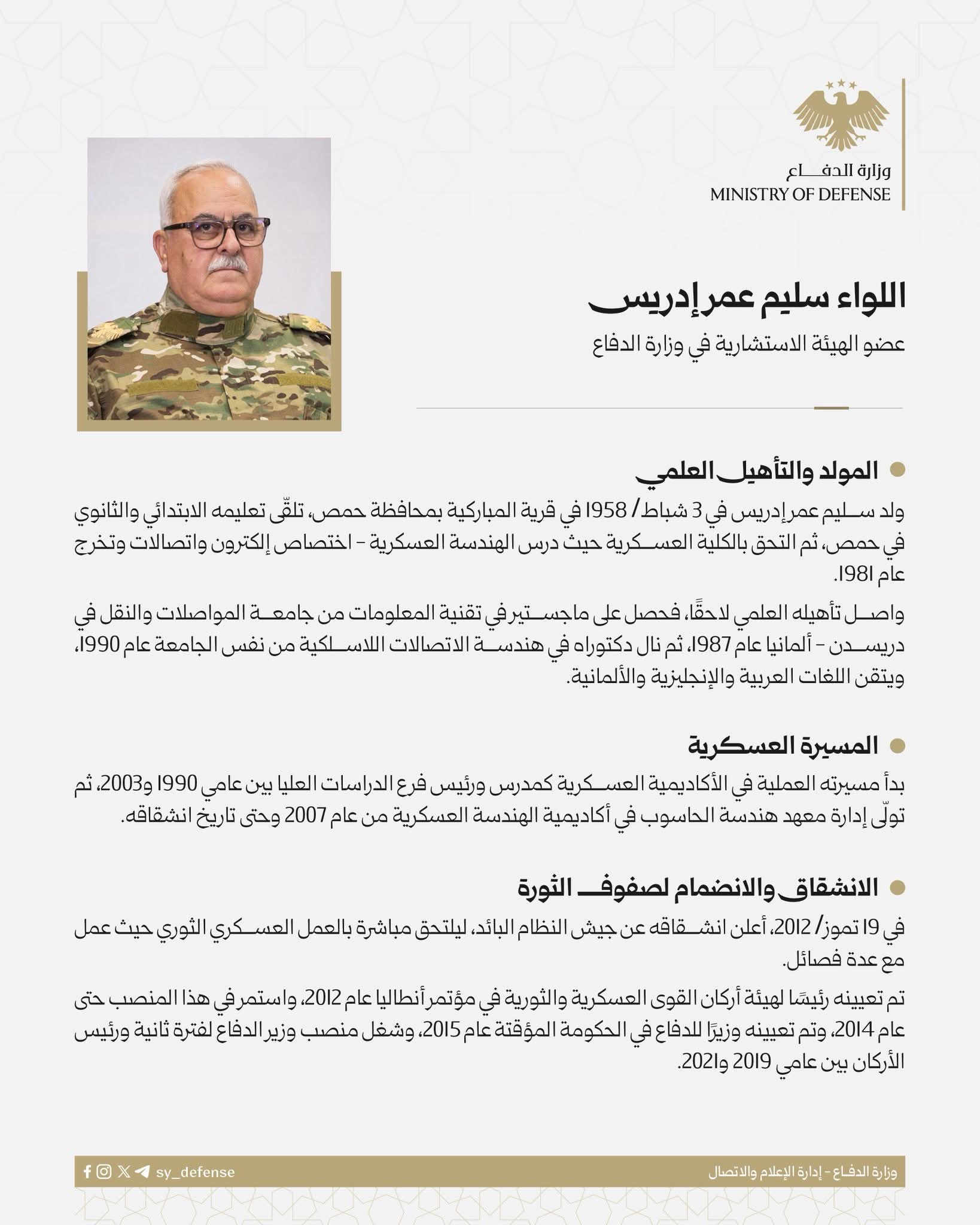 بعد سقوط نظام الأسد، عُيّن ضمن الهيئة الاستشارية في وزارة الدفاع التي أُعلن عنها بتاريخ 29 آذار/ مارس 2026.