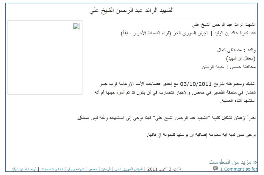 انشقاق الرائد عبد الرحمن الشيخ علي و النقيب عبد الله بحبوح من مرتبات الفرقة التاسعة وانضمامهم إلى كتيبة خالد بن الوليد في حمص