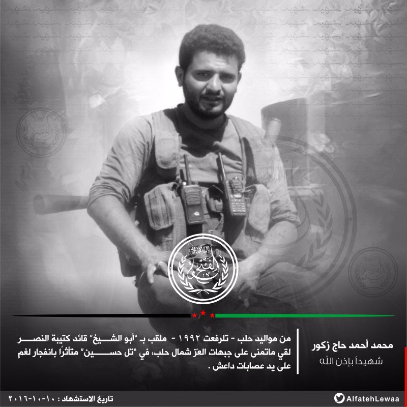 قتل في انفجار لغم كان قد زرعه تنظيم الدولة داعش في قرية تل حسين في ريف حلب الشمالي، وذلك في 10 تشرين الأول/أكتوبر 2016.