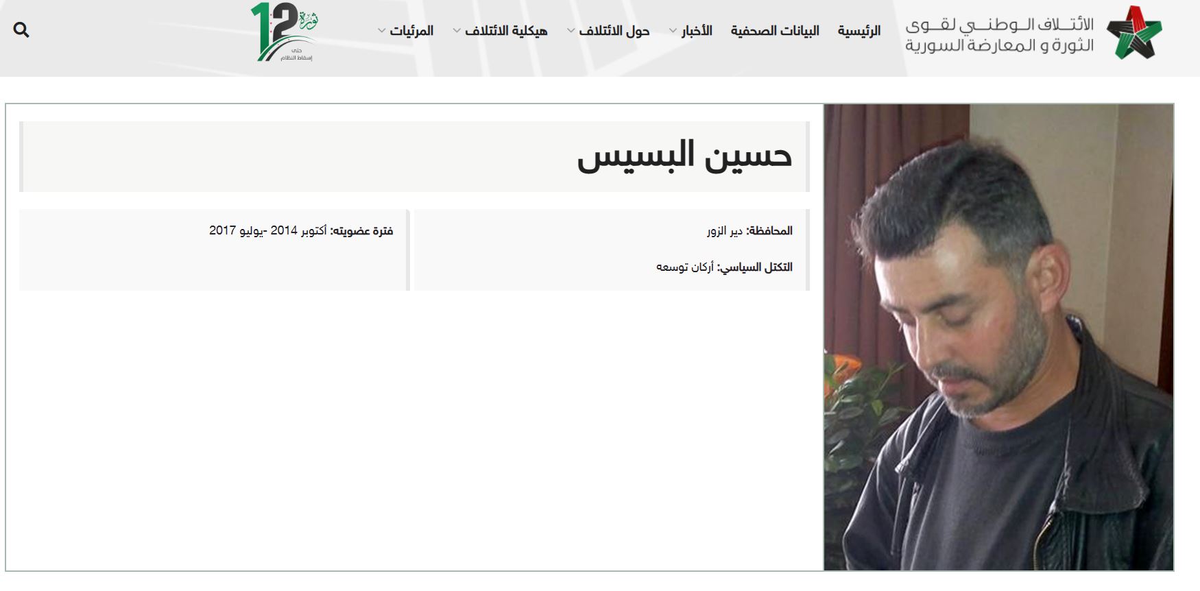 انضم إلى الائتلاف الوطني لقوى الثورة والمعارضة السورية كممثل عن كتلة الأركان في تشرين الأول/ أكتوبر 2014، واستمرت عضويته حتى تموز/ يوليو 2017.