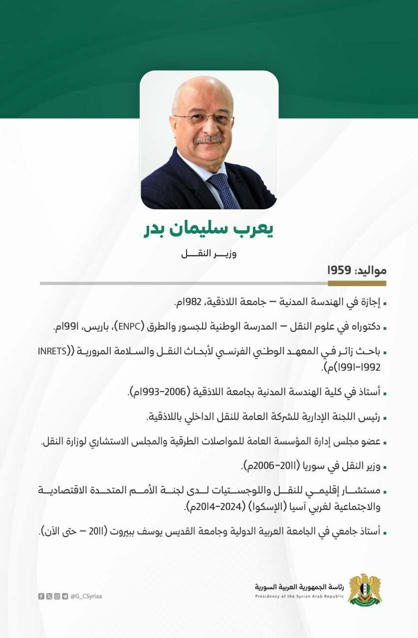 وزير النقل في الحكومة السورية الأولى برئاسة الرئيس أحمد الشرع.