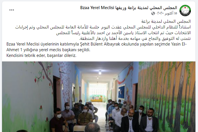 تعميم بتحديد يوم الأحد الموافق 15/03/2020 كعطلة رسمية في جميع المكاتب والمؤسسات والدوائر الرسمية في مجالس الباب وجرابلس وقباسين وبزاعة والغندورة.