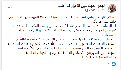 محضر اجتماع المكتب التنفيذي لتجمع المهندسين الأحرار في حلب بتاريخ 9/05/2015