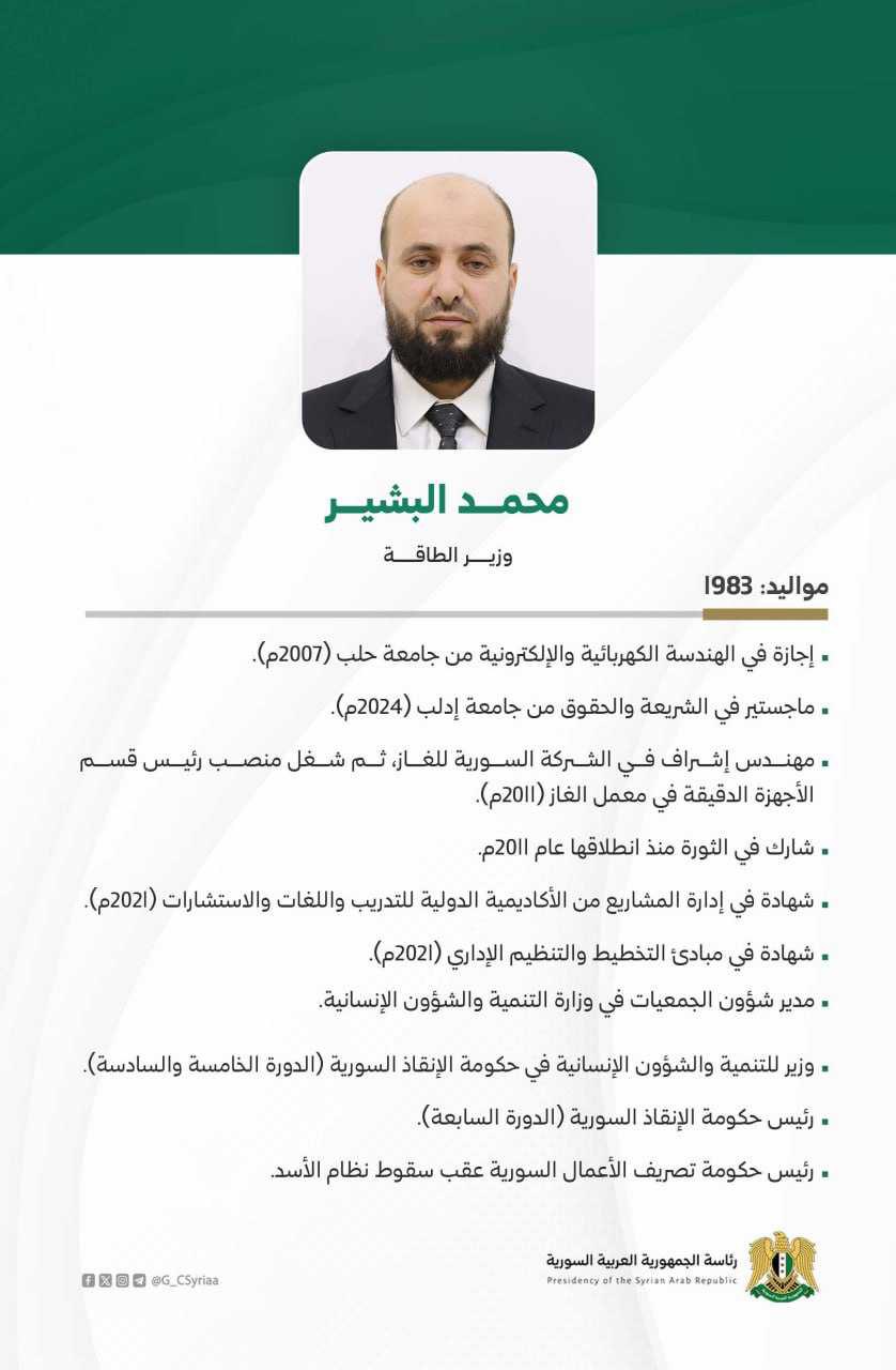 ثم في 29 آذار/ مارس 2025، صدر مرسوم بتعيينه وزيرًا للطاقة ضمن الحكومة السورية الأولى بقيادة أحمد الشرع.