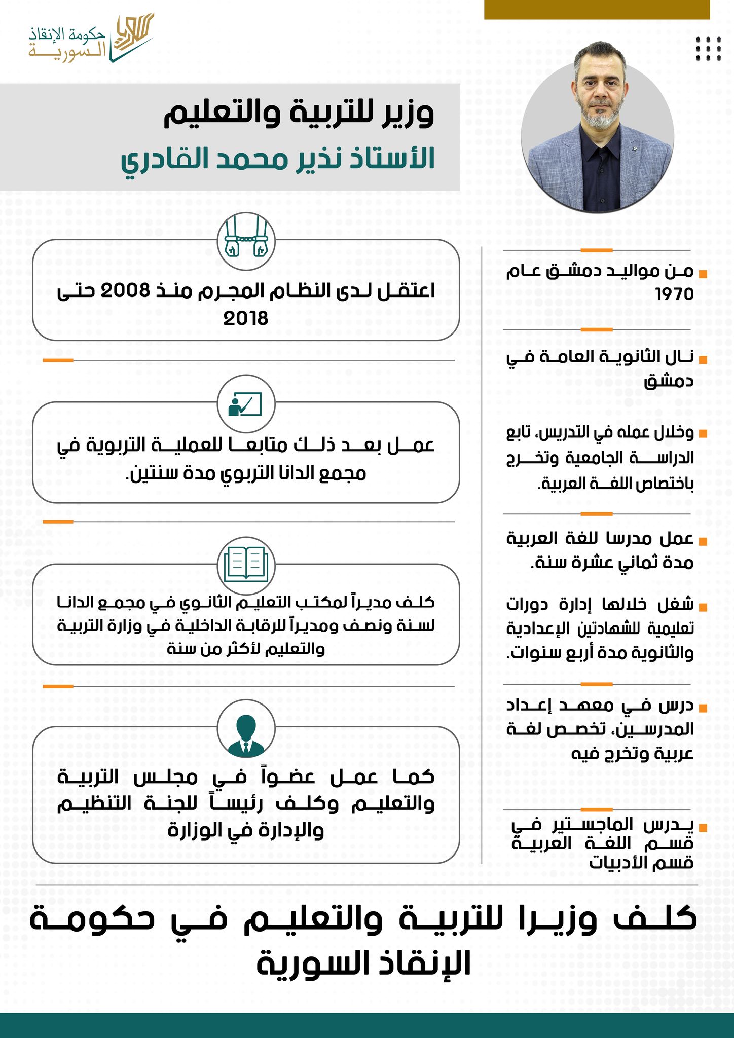 بعد سقوط نظام الأسد، أعلنت القيادة العامة" في 21 كانون الأول/ديسمبر 2024 تكليف نذير محمد القادري بحقيبة وزارة التربية والتعليم في حكومة تصريف الأعمال السورية.