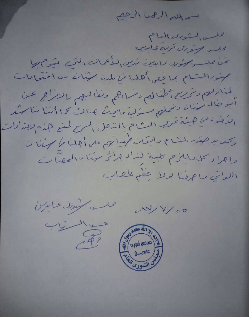 بيان مجلس شورى قرية عابدين حول ممارسات فصيل صقور الشام في بلدة شنان والاستنجاد بهيئة تحرير الشام
