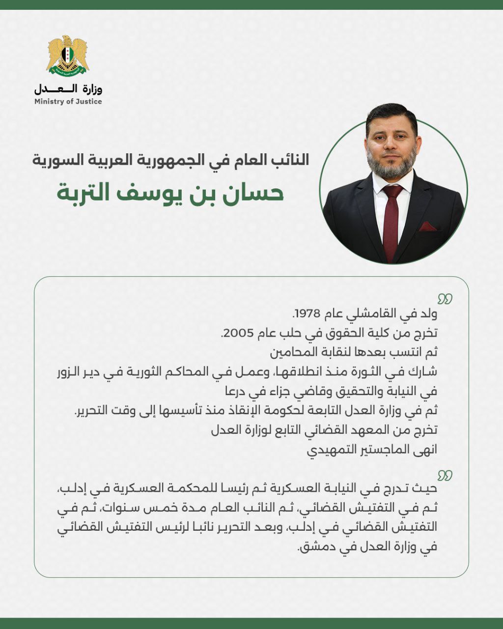 المرسوم 65 لعام 2025: تعيين السيد حسان يوسف التربة نائباً عاماً للجمهورية العربية السورية