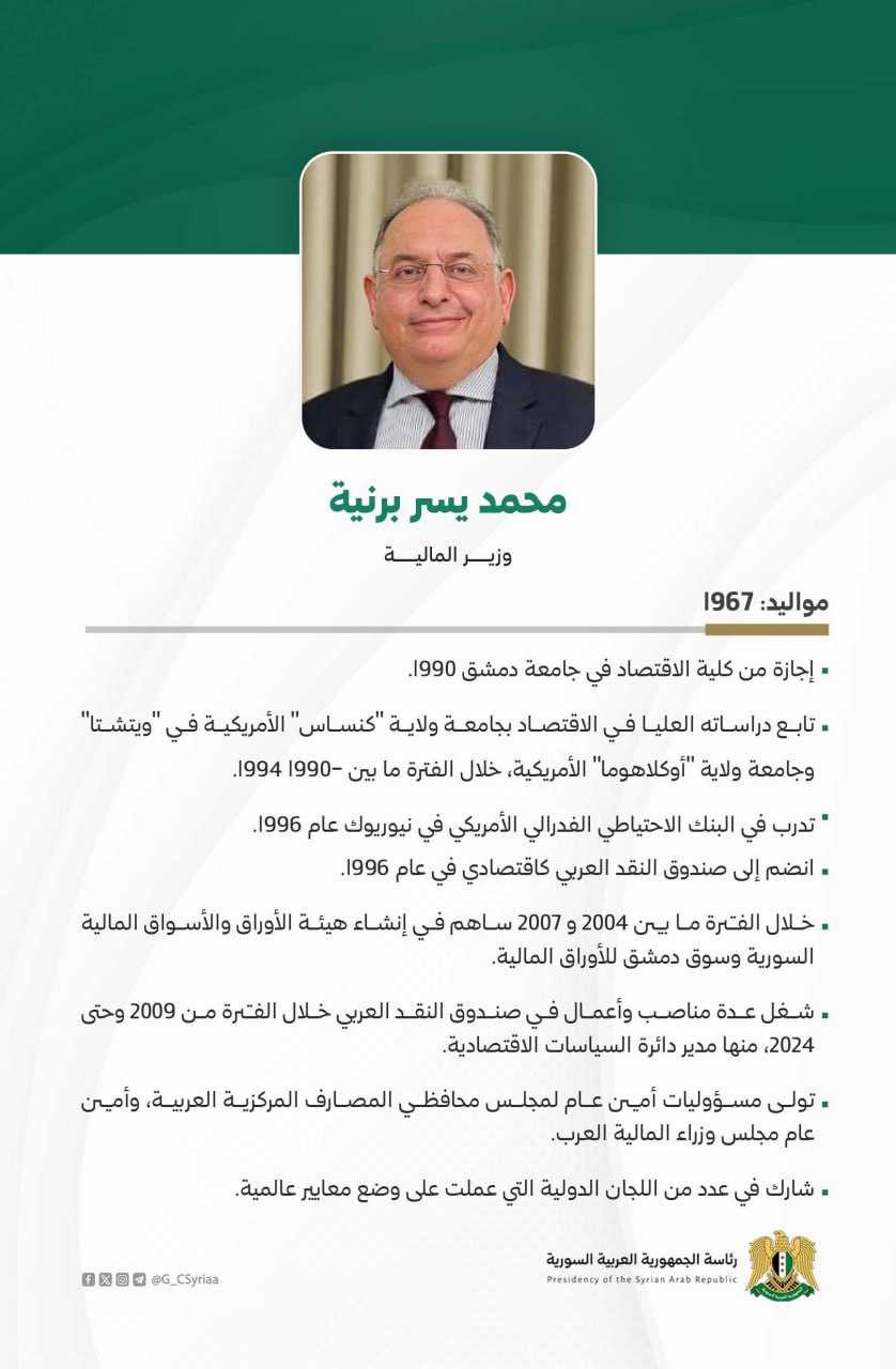 في 29 آذار/ مارس 2025 عُيّن محمد يسر برنية وزيرًا للمالية في الحكومة السورية الأولى برئاسة الرئيس أحمد الشرع.