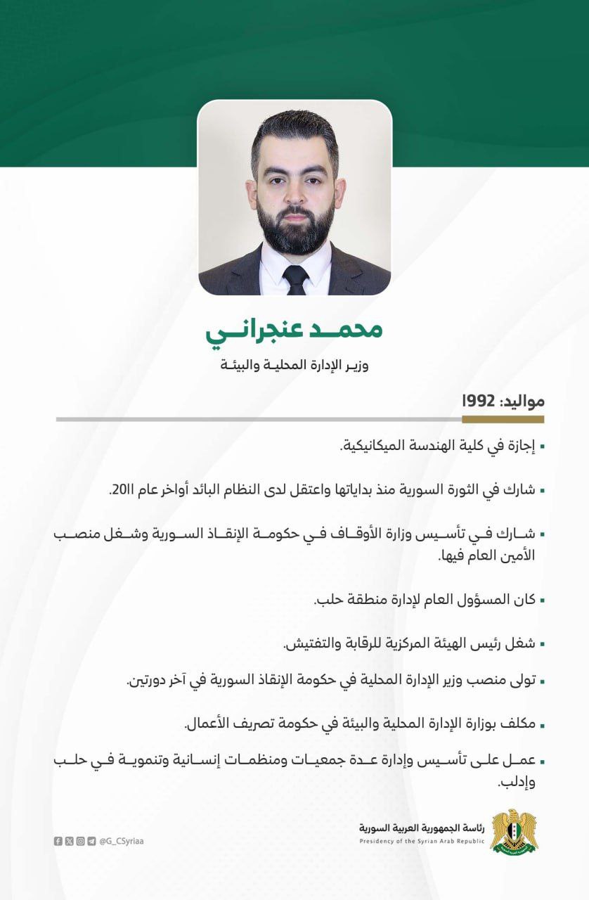 في 21 كانون الأول/ ديسمبر 2024 أعلنت "القيادة العامة" تكليف محمد عنجراني بحقيبة وزارة الإدارة المحلية والبيئة في الحكومة السورية الجديدة بعد سقوط نظام الأسد. في 29 آذار/ مارس 2025 عُيّن وزيرًا للإدارة المحلية في الحكومة السورية الأولى برئاسة الرئيس أحمد الشرع.