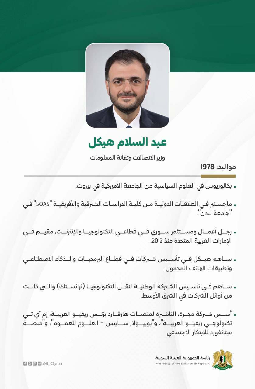 وزير الاتصالات وتقانة المعلومات في الحكومة السورية الأولى برئاسة الرئيس أحمد الشرع منذ 29 آذار/ مارس 2025.