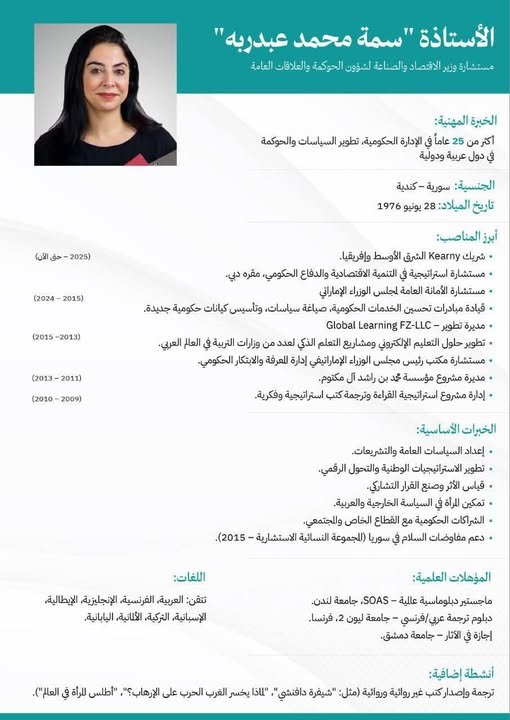 ناشطة ومترجمة، مستشار أول سابق لوزير الاقتصاد والصناعة لشؤون الحوكمة والعلاقات العامة منذ أيار/ مايو 2025 وحتى 19 تموز/ يوليو 2025.