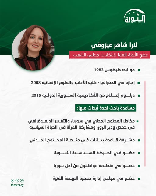 بعد سقوط نظام الأسد في كانون الأول/ ديسمبر 2024، عُيّنت عضوًا في اللجنة العليا لانتخابات مجلس الشعب بموجب المرسوم الرئاسي رقم 66 لعام 2025 الصادر في 2 حزيران/ يونيو 2025.
