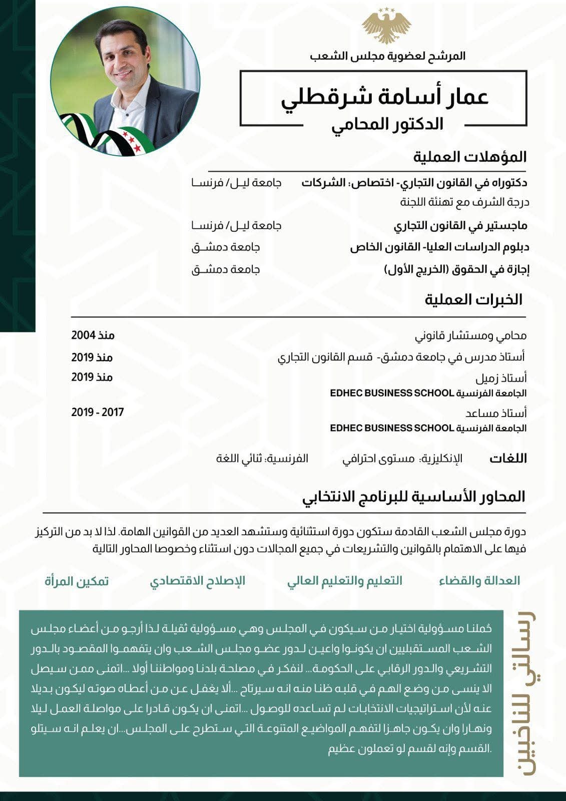 نائب في مجلس الشعب السوري منذ 6 تشرين الأول/ أكتوبر 2025.
