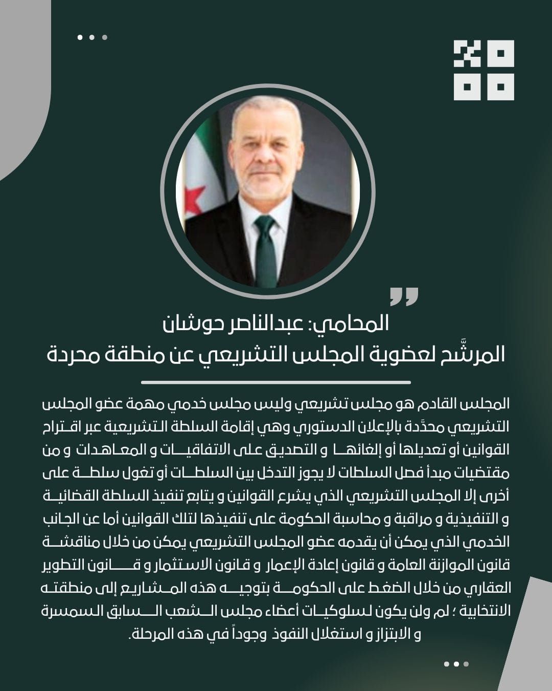 نائب في مجلس الشعب السوري منذ 6 تشرين الأول/ أكتوبر 2025.