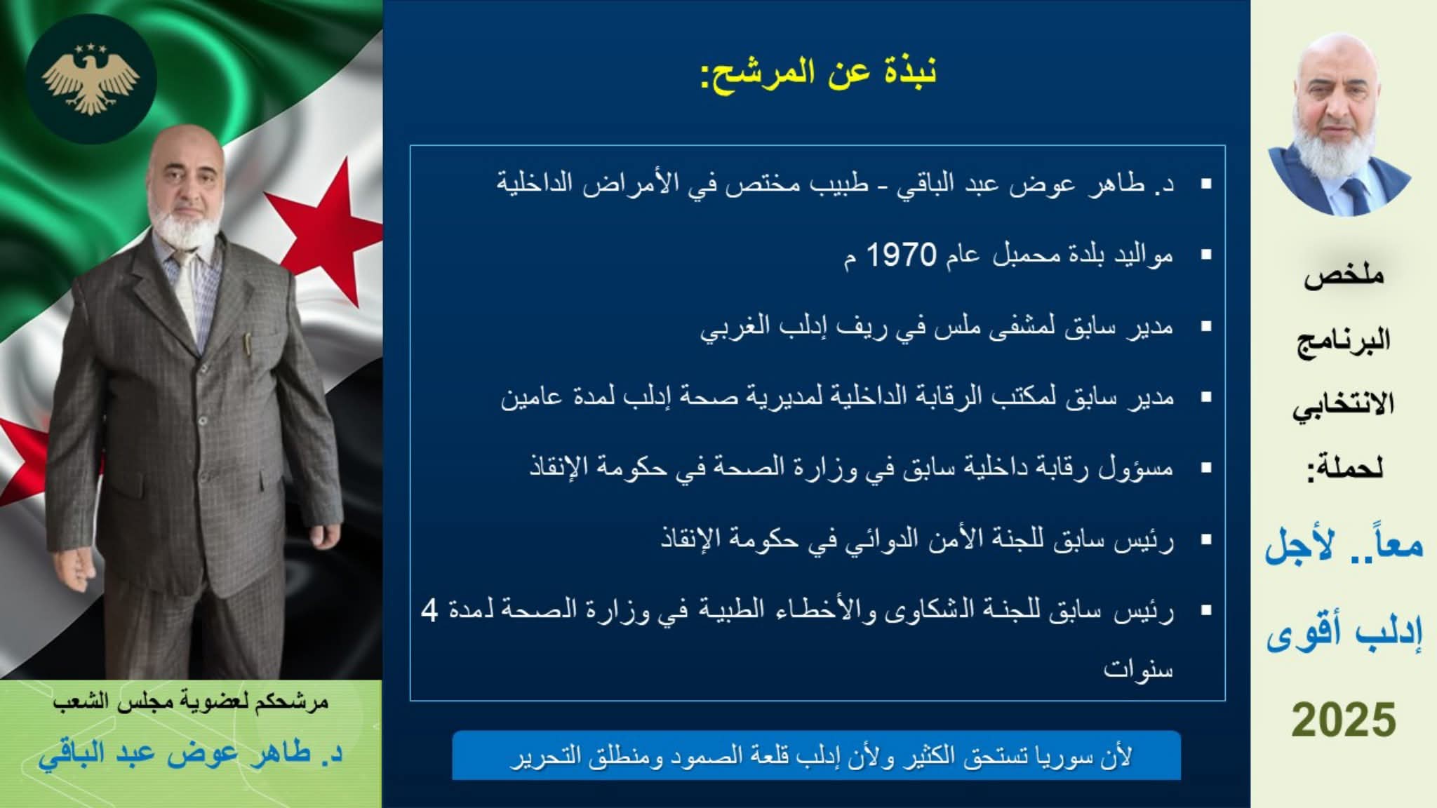 بعد سقوط نظام الأسد، شارك في مؤتمر الحوار الوطني السوري، ثم ترشح لانتخابات مجلس الشعب الجديد ممثلاً عن دائرة أريحا، وأُعلن فوزه في الانتخابات بتاريخ 6 تشرين الأول/ أكتوبر 2025.