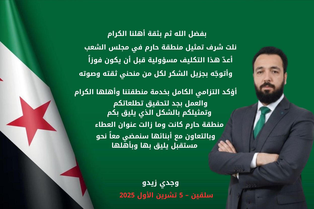 بعد سقوط نظام الأسد، ترشّح لانتخابات مجلس الشعب عن دائرة حارم، وأعلن نجاحه في الانتخابات بتاريخ 6 تشرين الأول/ أكتوبر 2025.
