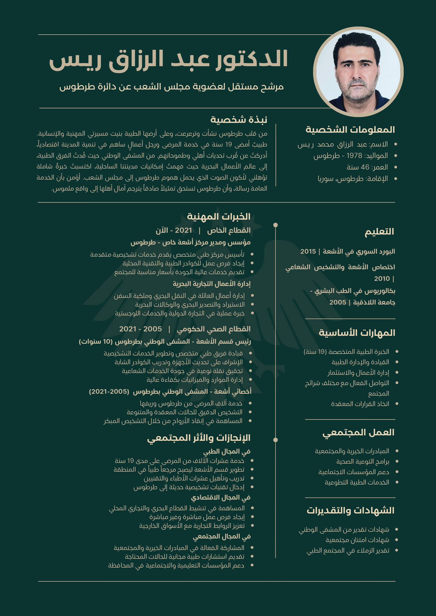 عمل في المستشفى الوطني في طرطوس بين عامي 2005 و 2021، وشغل منصب رئيس قسم الأشعة فيه.