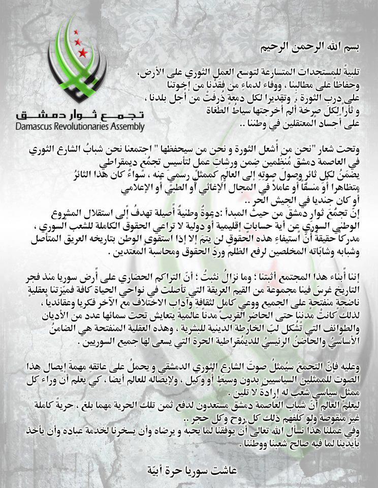 وأُعلن تأسيس "تجمع ثوار دمشق" الذي قال بيان التأسيس إنه يضم "شباب الشارع الثوري في العاصمة دمشق".