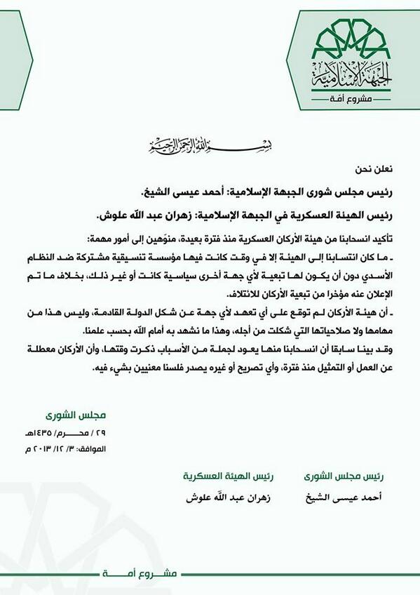 أصدر قائد "ألوية صقور الشام" ورئيس مجلس شورى " الجبهة الإسلامية" أحمد عيسى الشيخ وقائد "جيش الإسلام" ورئيس الهيئة العسكرية في "الجبهة الإسلامية" زهران علوش بيانًا مشتركًا، أكدا فيها انسحابهما "منذ فترة بعيدة" من "هيئة الأركان العامة للجيش السوري الحر"، مشيران إلى أن انتسابهما إلى الهيئة عندما كانت مؤسسة تنسيقية مشتركة ضد النظام ولا تتبع لأي جهة سياسية.