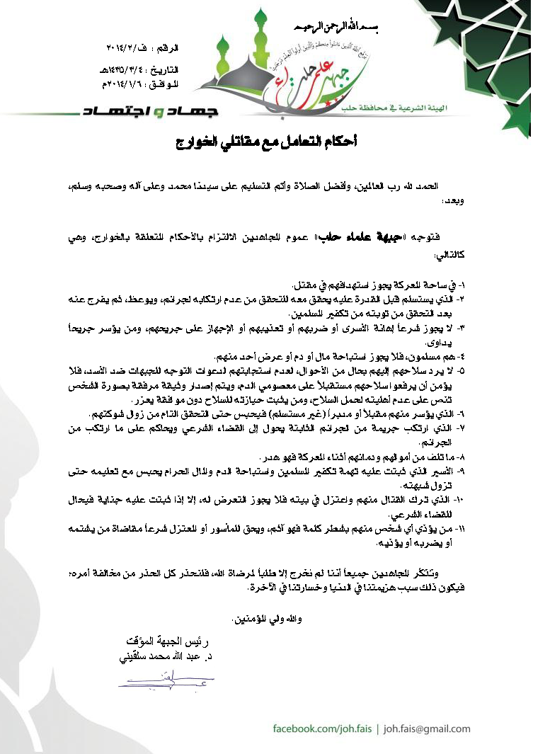 وخرج المئات في مظاهرة أمام مقر "تجمع فاستقم كما أمرت" (أحد مكونات "جيش المجاهدين") في مدينة حلب للمطالبة بوقف الاقتتال وإنهاء "الفتنة"، وأصدرت "جبهة علماء حلب" فتوى تبين قواعد قتال الخوارج مؤكدة على جواز استهدافهم وقتلهم خلال المعركة وعدم جواز تصفية الأسرى منهم أو أخذ غنائم.