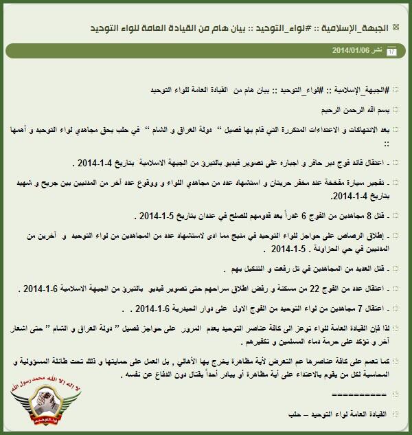 وصلت الاشتباكات بين الجيش الحر و"داعش" إلى أحياء الشعار وقاضي عسكر والقطانة في مدينة حلب، وشهدت الاشتباكات مشاركة مجموعات من "لواء التوحيد" بشكل واسع وهو أحد مكونات "الجبهة الإسلامية"، وذكر المرصد السوري أن عنصرًا من "داعش" (16 عامًا) فجر نفسه أثناء محاولة اعتقاله قرب دوار الشعار ما تسبب بمقتل اثنين من الجيش الحر، وسيطر "جيش المجاهدين" على جميعة الأرمن وقرية بالا قرب عنجارة في ريف حلب الغربي، في حين أرسل تنظيم "داعش" تعزيزات من إعزاز إلى تل رفعت بعد أنباء عن مقتل الرجل الثاني في "داعش" المدعو حجي بكر على يد مقاتلين محليين ينتمي معظمهم إلى "لواء التوحيد".