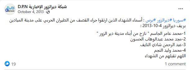 وذكر "مركز حقوق الإنسان في دير الزور" مقتل العنصر في "حركة أحرار الشام" محمد خليفة العليوي تحت التعذيب في سجون النظام بعد اعتقاله مصابًا على إحدى جبهات القتال في محافظة الحسكة.