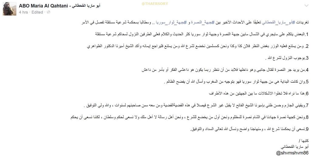 من جانب آخر، هاجمت "جبهة النصرة" مقرات "جبهة ثوار سوريا" في منطقة سهل الروج وبلدة حفسرجة وقتلت القيادي قصي محمد الأحمد وشقيقه، وذكرت مصادر أن ن اغتيال الشرعي في "جبهة النصرة" أبو مشاري الأردني فجر المواجهات بين الطرفين مشيرة إلى أن التوتر بينهما يعود إلى أشهر سابقة عندما سيطرت "النصرة" على مقرات "لواء ذئاب الغاب" في منطقة دركوش.