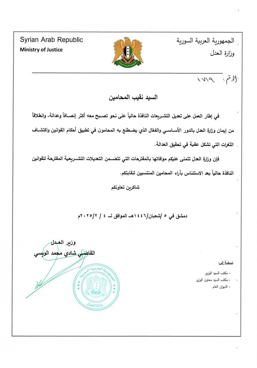 وجهت وزارة العدل كتبًا إلى وزارة التعليم العالي ومحكمة النقض وإدارات التفتيش والتشريع والنائب العام ونقابة المحامين، تطلب فيها مقترحات لتعديل القوانين النافذة، مستندة إلى آراء الأكاديميين والقضاة والمحامين، بهدف معالجة العقبات وتحقيق عدالة وفعالية أكبر.