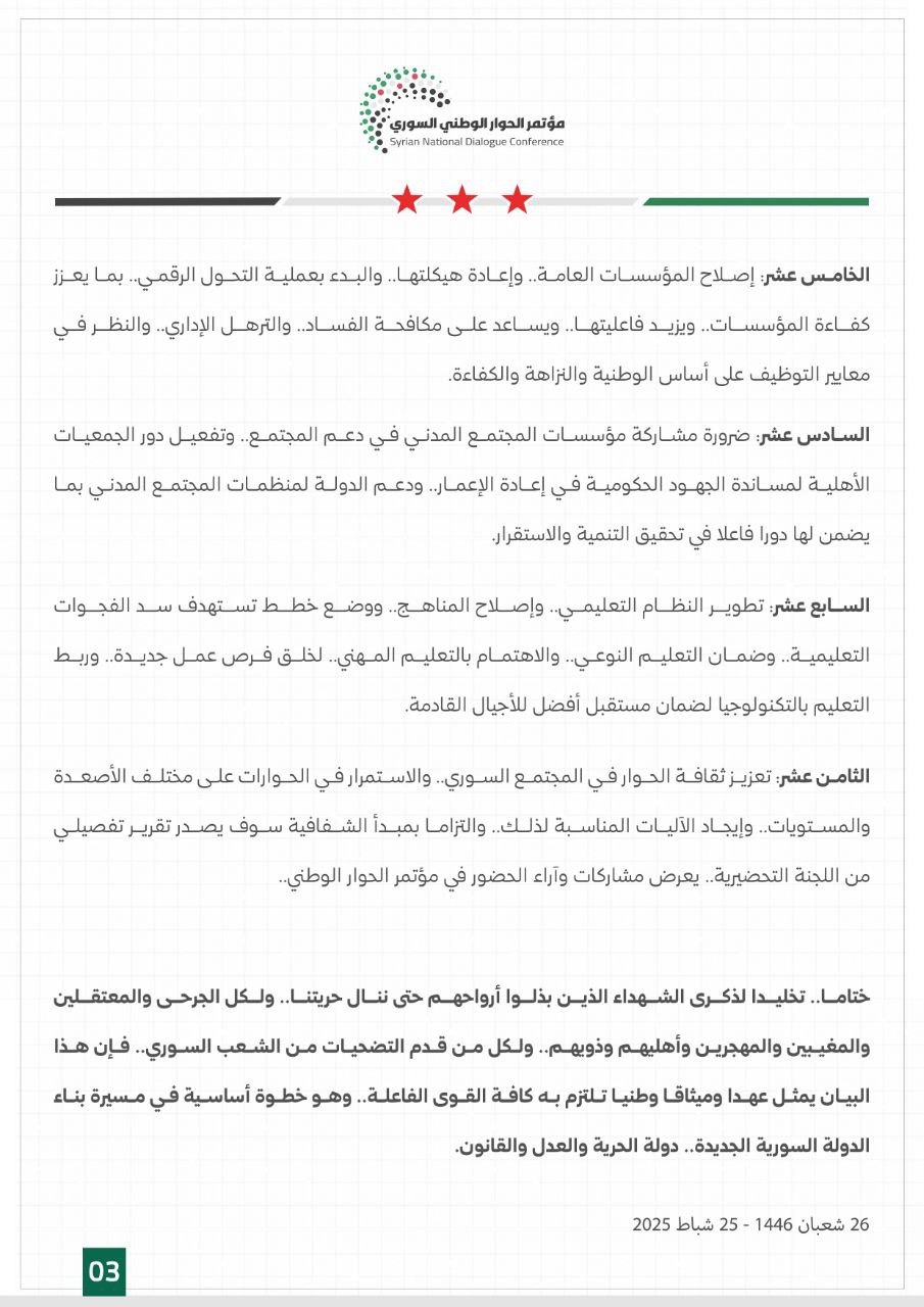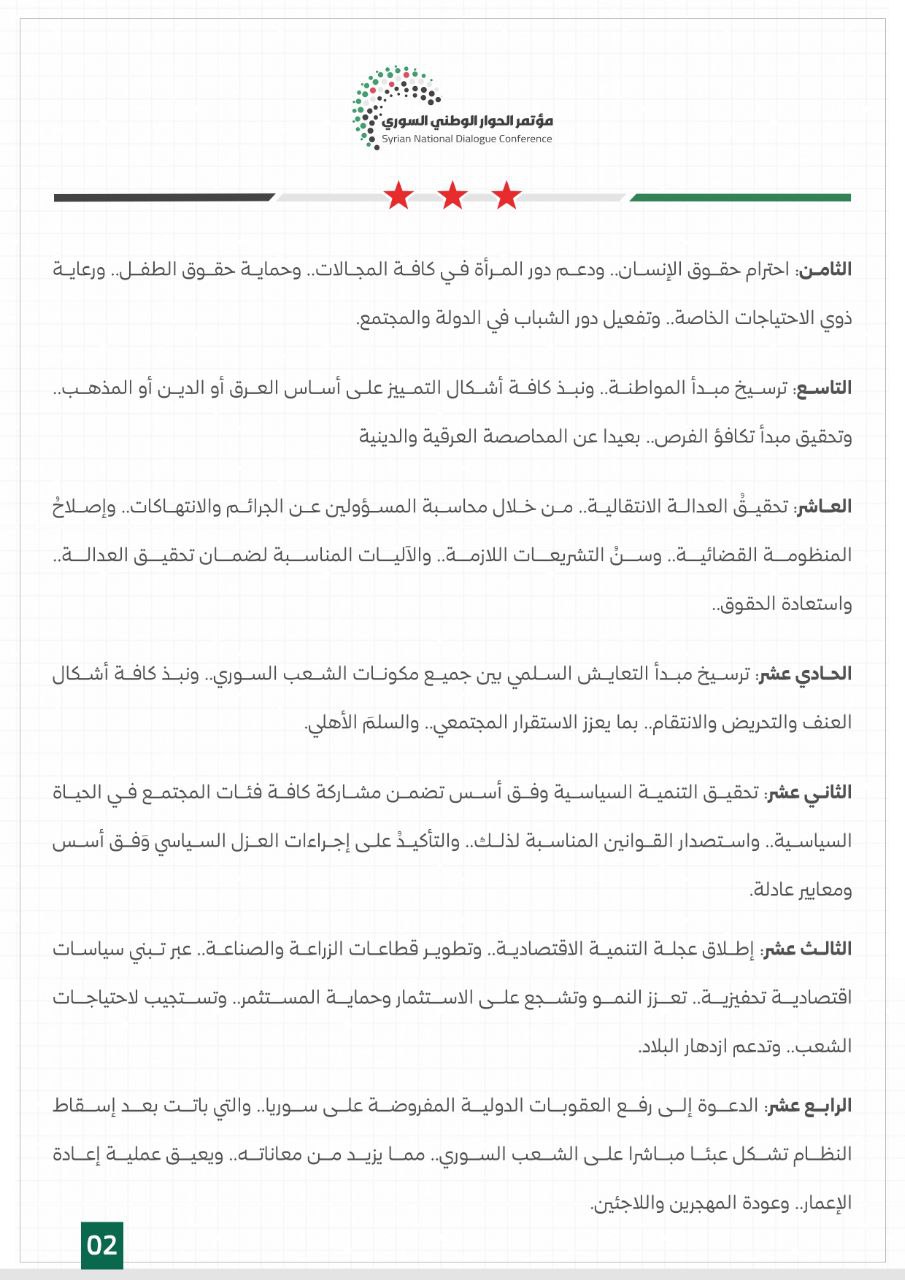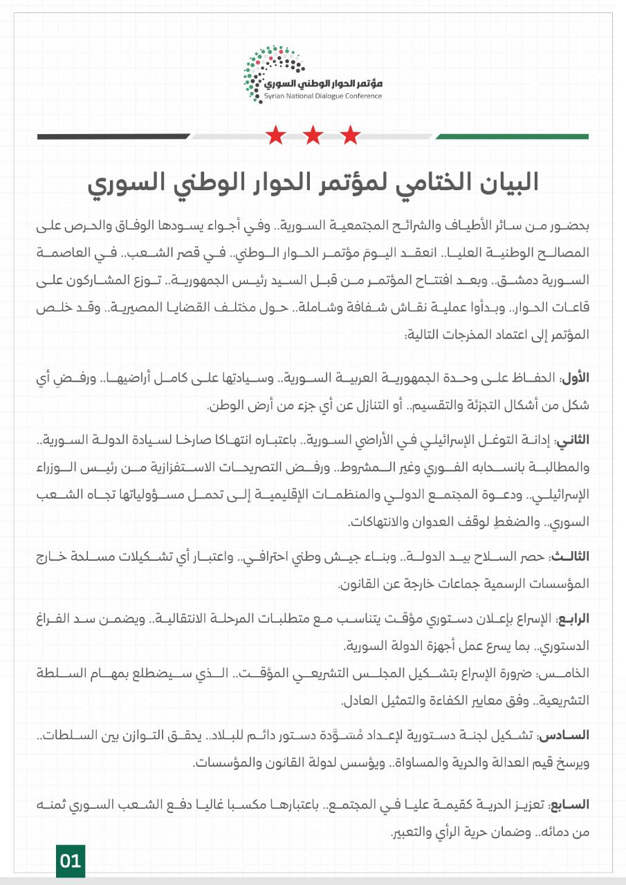 وتضمن البيان الختامي للمؤتمر 18 نقطة، أبرزها الحفاظ على وحدة الجمهورية العربية السورية ورفض التقسيم، وإدانة التوغل الإسرائيلي في الأراضي السورية، وحصر السلاح بيد الدولة واعتبار أي تشكيلات مسلحة خارج المؤسسات الرسمية جماعات خارجة عن القانون، والإسراع بإعلان دستوري مؤقت، وتشكيل لجنة دستورية لإعداد دستور دائم للبلاد، وتعزيز الحرية كقيمة عليا في المجتمع، واحترام حقوق الإنسان، وترسيخ مبدأ المواطنة، وتحقيق العدالة الانتقالية، وترسيخ مبدأ التعايش السلمي، وتحقيق التنمية السياسية وفق أسس تضمن مشاركة كافة فئات المجتمع في الحياة السياسية، وإطلاق عجلة التنمية الاقتصادية، والدعوة إلى رفع العقوبات الدولية المفروضة على سورية، وإصلاح المؤسسات العامة وإعادة هيكلتها، وضرورة مشاركة مؤسسات المجتمع المدني في دعم المجتمع ومساندة الجهود الحكومية في إعادة الإعمار، وتطوير النظام التعليمي، وتعزيز ثقافة الحوار في المجتمع السوري.