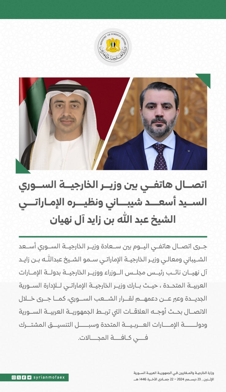 أجرى وزير الخارجية السوري أسعد الشيباني، اتصالًا هاتفيًا مع نائب رئيس مجلس الوزراء ووزير خارجية الإمارات الشيخ عبد الله بن زايد آل نهيان، الذي هنأ الإدارة السورية الجديدة، وأكد دعم بلاده قرار الشعب السوري، وبحث الجانبان العلاقات الثنائية وسُبل تعزيز التنسيق المشترك.