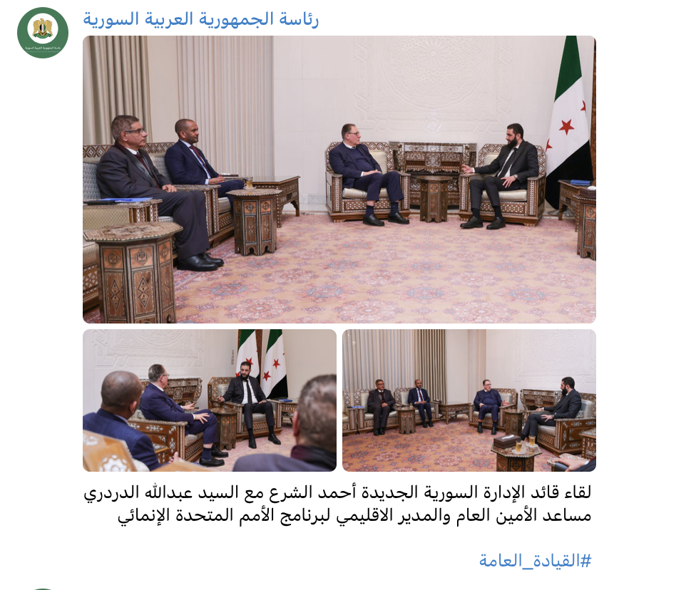استقبل قائد الإدارة السورية الجديدة أحمد الشرع مساعد الأمين العام للأمم المتحدة والمدير الإقليمي لبرنامج الأمم المتحدة الإنمائي عبدالله الدردري، في العاصمة دمشق.