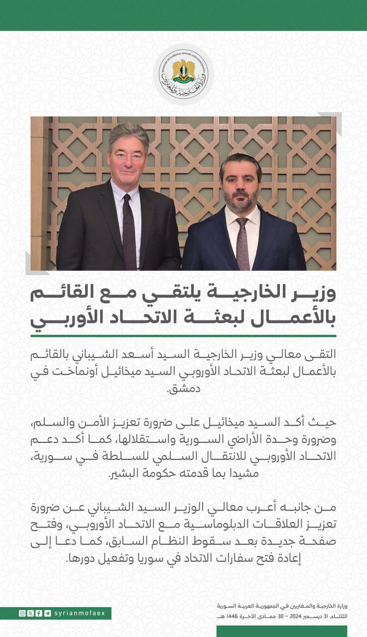 استقبل وزير الخارجية السوري أسعد الشيباني القائم بأعمال بعثة الاتحاد الأوروبي في دمشق ميخائيل أونماخت، ودعا الشيباني إلى فتح صفحة جديدة مع الاتحاد الأوروبي، وإعادة فتح السفارات وتفعيل دورها في سورية، بينما أكد أونماخت دعم الاتحاد الأوروبي لوحدة سورية واستقلالها، والانتقال السلمي للسلطة.