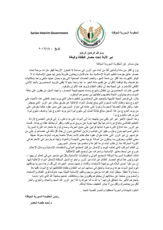 تناشد الحكومة السورية المؤقتة المجتمع الدولي والمنظمات الإنسانية وكلّ ذي ضمير حي في العالم أن يهبوا -اليوم وليس غداً-لرفع الحصار الظالم عن أبناء دير الزور واجتراح السبل الممكنة لإدخال المواد الإغاثية إليها. إن من أبلوا أحسن البلاء في مواجهة الاستبداد، وكانت أرضهم مصدر الخيرات إلى كل أرجاء سوريا يساكنهم اليوم شبح الموت جوعا ومرضاً، وتحلق في سمائهم أسراب النظام وحلفائه فتتقاذفهم أنواع الموت كلها بلا رحمة ولا شفقة. سيظل أبناء الفرات مؤمنين بربهم وبالقيم الإنسانية النبيلة مهما حاولت قوى الظلام والاستبداد والمضربون صفحاً عن معاناتهم أن يجعلوهم يكفرون بها، وستنكشف غمتهم بمشيئة الله الذي نادوا باسمه بشعارهم الأثير منذ انطلاق ثورتهم " يا الله ما لنا غيرك يا الله" دير الزور لك المجد والحياة، والخزي والعار لكل من يحاصرك ولكل من لا يبادر لتخفيف معاناة أبنائك.