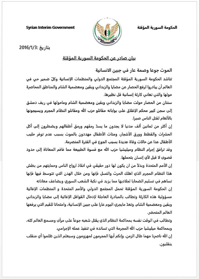 إن الحكومة السورية المؤقتة تحمل المجتمع الدولي والأمم المتحدة و المنظمات الإغاثية مسؤولية هذه الكارثة وتطالب بالمبادرة العاجلة لإدخال القوافل الإغاثية إلى مضايا والزبداني وبقين ومعضمية الشام، وتعدّ مايجري اليوم عارا على جبين الإنسانية، وامتحانا للقيم التي يرفعها العالم المتحضر.