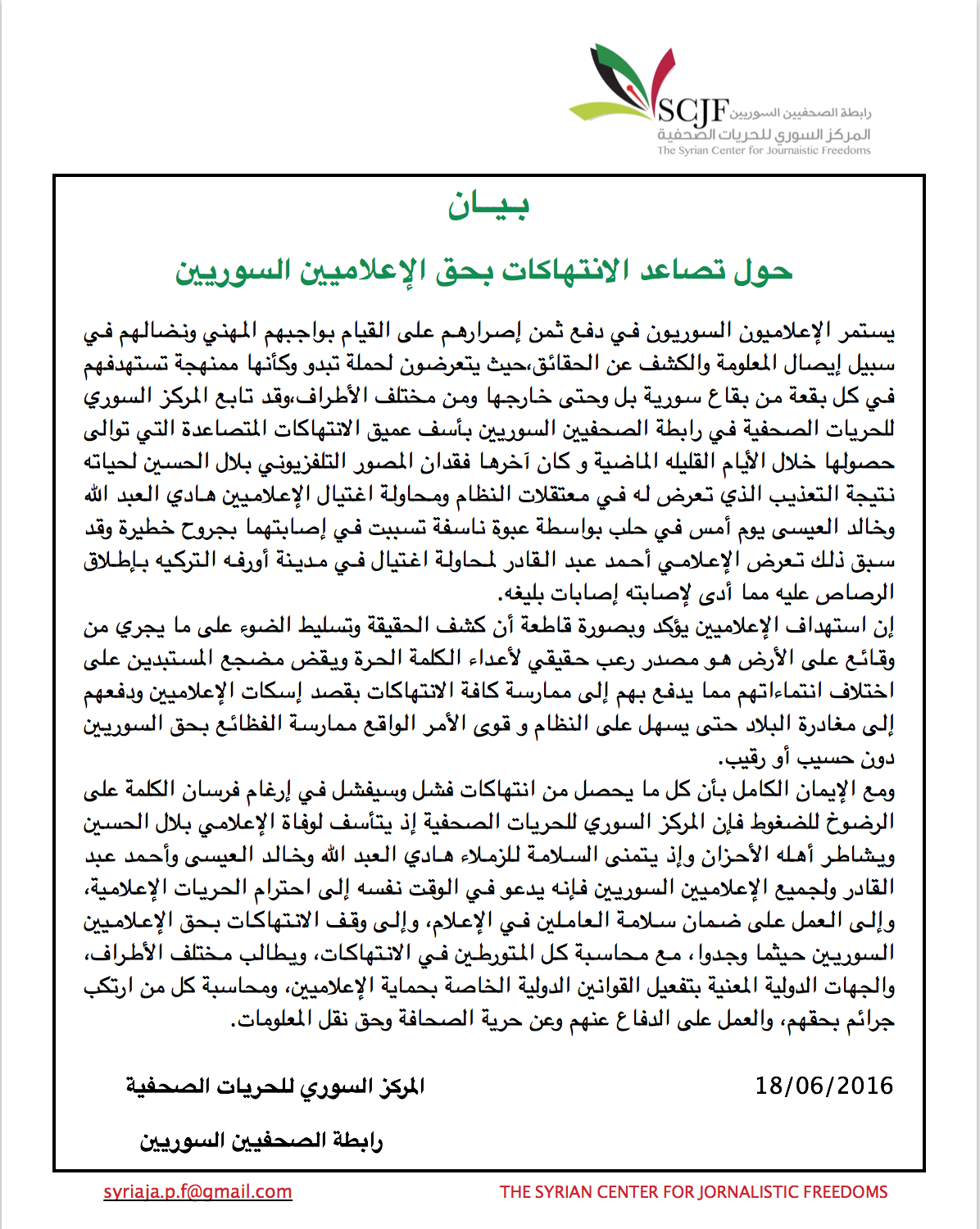ومع الإيمان الكامل بأن كل ما يحصل من انتهاكات فشل وسيفشل في إرغام فرسان الكلمة على الرضوخ للضغوط فإن المركز السوري للحريات الصحفية إذ يتأسف لوفاة الإعلامي بلال الحسين ويشاطر أهله الأحزان وإذ يتمنى السلامة للزملاء هادي العبد الله وخالد العيسى وأحمد عبد القادر ولجميع الإعلاميين السوريين فإنه يدعو في الوقت نفسه إلى احترام الحريات الإعلامية، وإلى العمل على ضمان سلامة العاملين في الإعلام، وإلى وقف الانتهاكات بحق الإعلاميين السوريين حيثما وجدوا، مع محاسبة كل المتورطين في الانتهاكات، ويطالب مختلف الأطراف، والجهات الدولية المعنية بتفعيل القوانين الدولية الخاصة بحماية الإعلاميين، ومحاسبة كل من ارتكب جرائم بحقهم، والعمل على الدفاع عنهم وعن حرية الصحافة وحق نقل المعلومات.