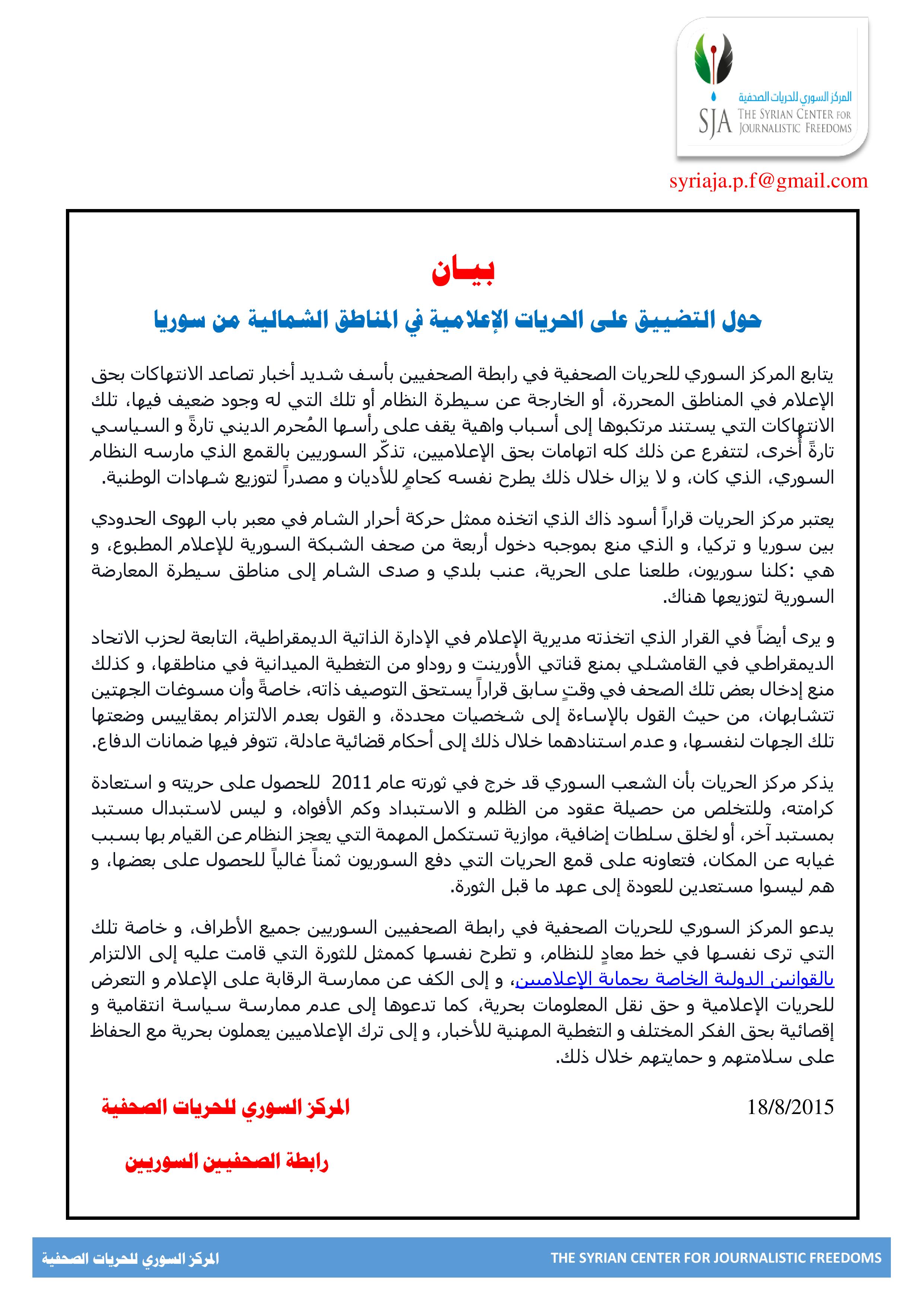 بيـان حول التضييق على الحريات الإعلامية في المناطق الشمالية من سوريا