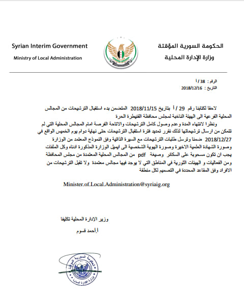 تعميم تمديد استقبال طلبات الترشح للهيئة الناخبة لمجلس محافظة القنيطرة