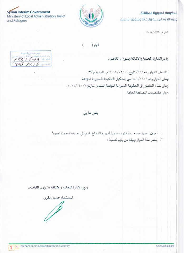 قرار تعين مدير الدفاع المدني في محافظة حماة