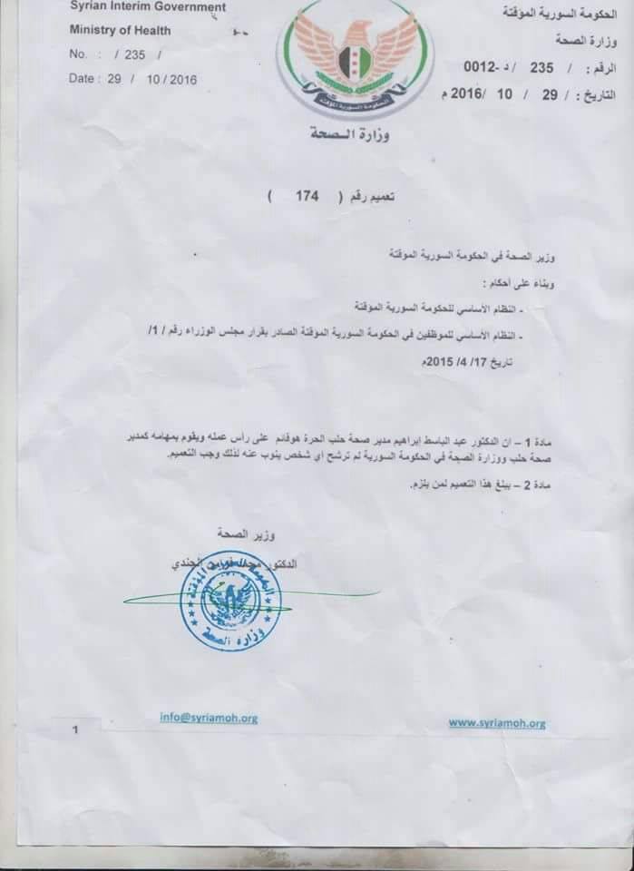 تعميم الحكومة السورية المؤقتة حول تواجد الدكتور عبد الباسط إبراهيم على رأس عمله كمدير لصحة حلب