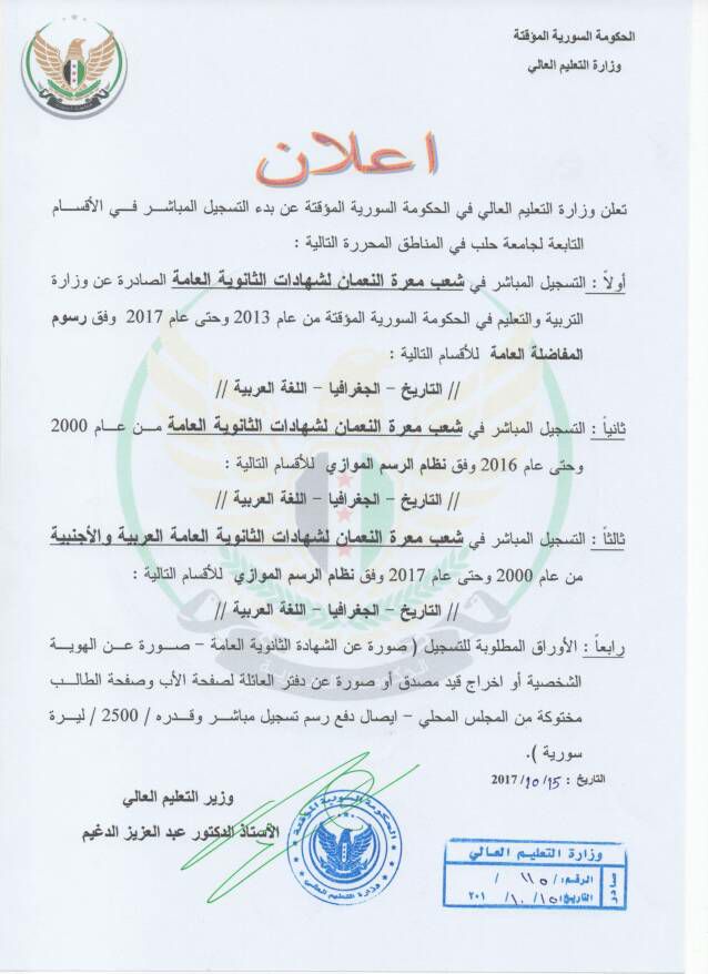إعلان بدء التسجيل في الأقسام التابعة لجامعة حلب الحرة في شعب معرة النعمان