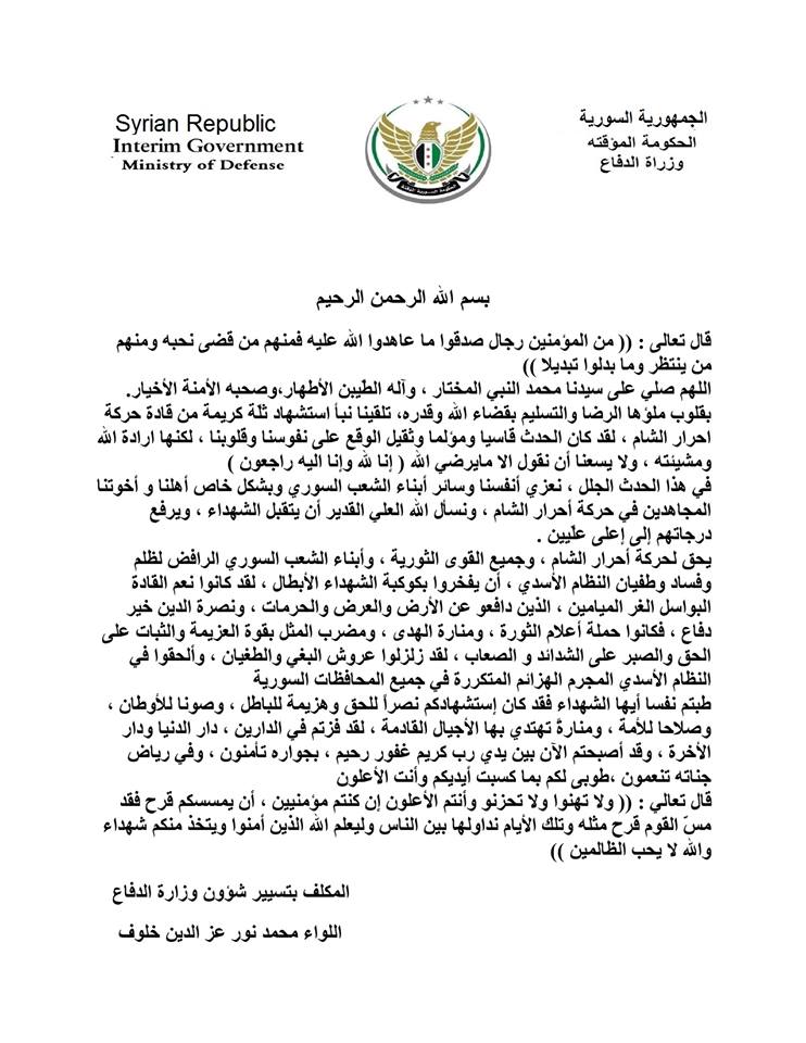 وزارة الدفاع في الحكومة المؤقتة تعزي باستشهاد قادة حركة أحرار الشام