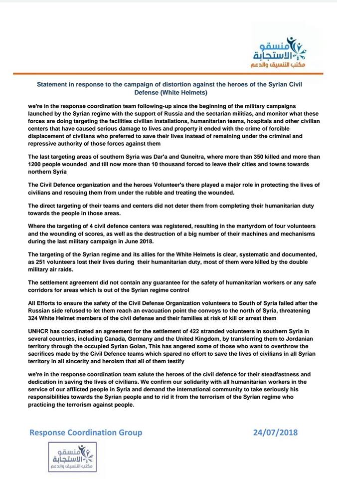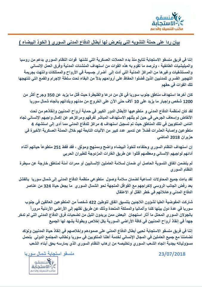 بيانلـ"منسقو استجابة سوريا" رداً على حملة التشويه التي يتعرض لها أبطال الدفاع المدني السوري ( الخوذ البيضاء )