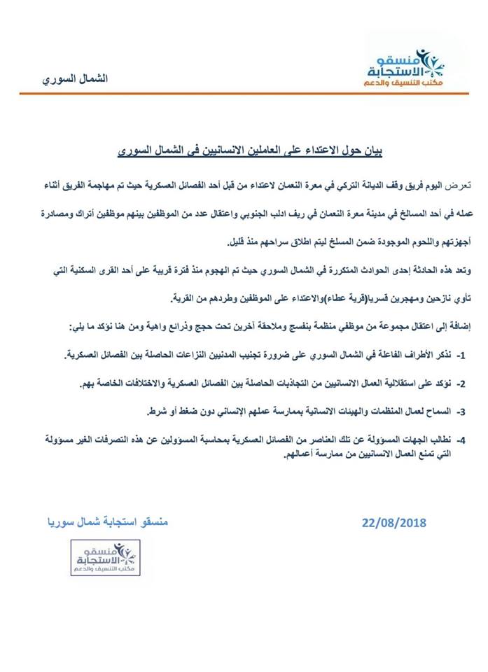 بيان لـ"منسقو استجابة سوريا" حول الاعتداء على العاملين الانسانيين في الشمال السوري