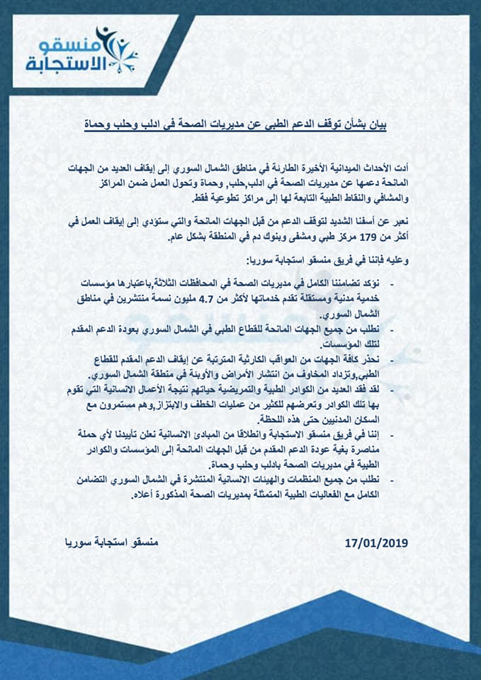 بيان من منسقو الاستجابة بشأن توقف الدعم الطبي عن مديريات الصحة في إدلب وحلب وحماة