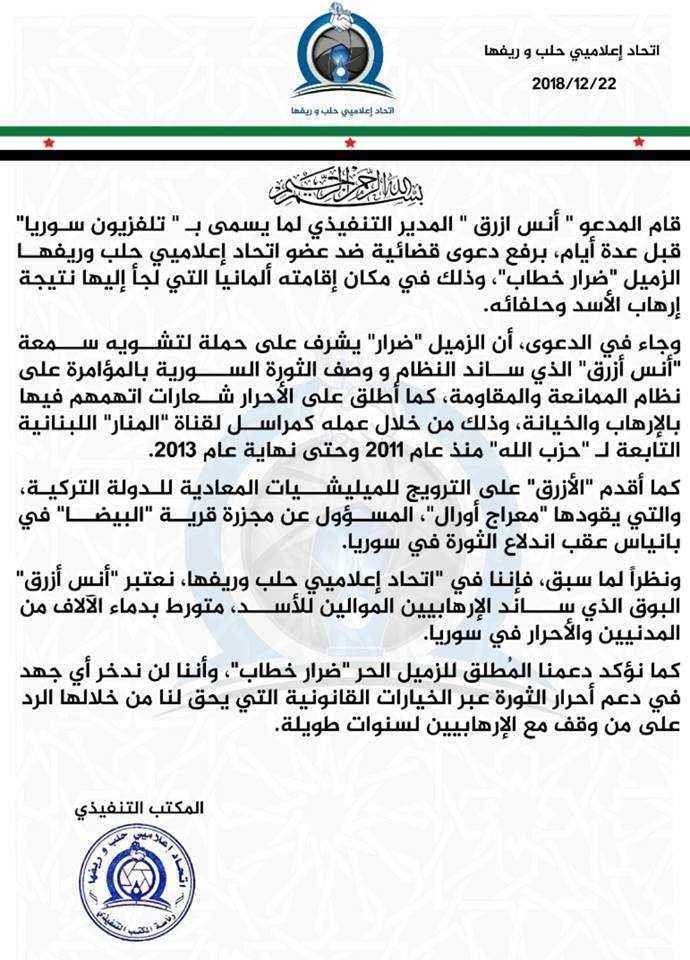 بيان حول الدعوى القضائية التي رفعها أنس الأزرق ضد عضو اتحاد إعلاميي حلب وريفها ضرار خطاب
