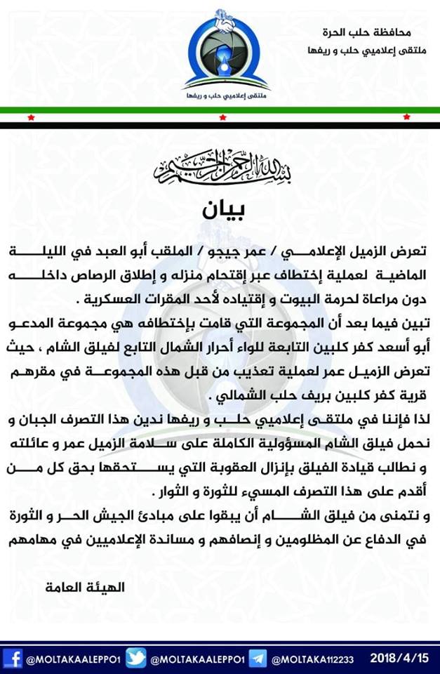 بيان اتحاد إعلامي حلب وريفها بخصوص إختطاف الزميل الإعلامي عمر جيجو
